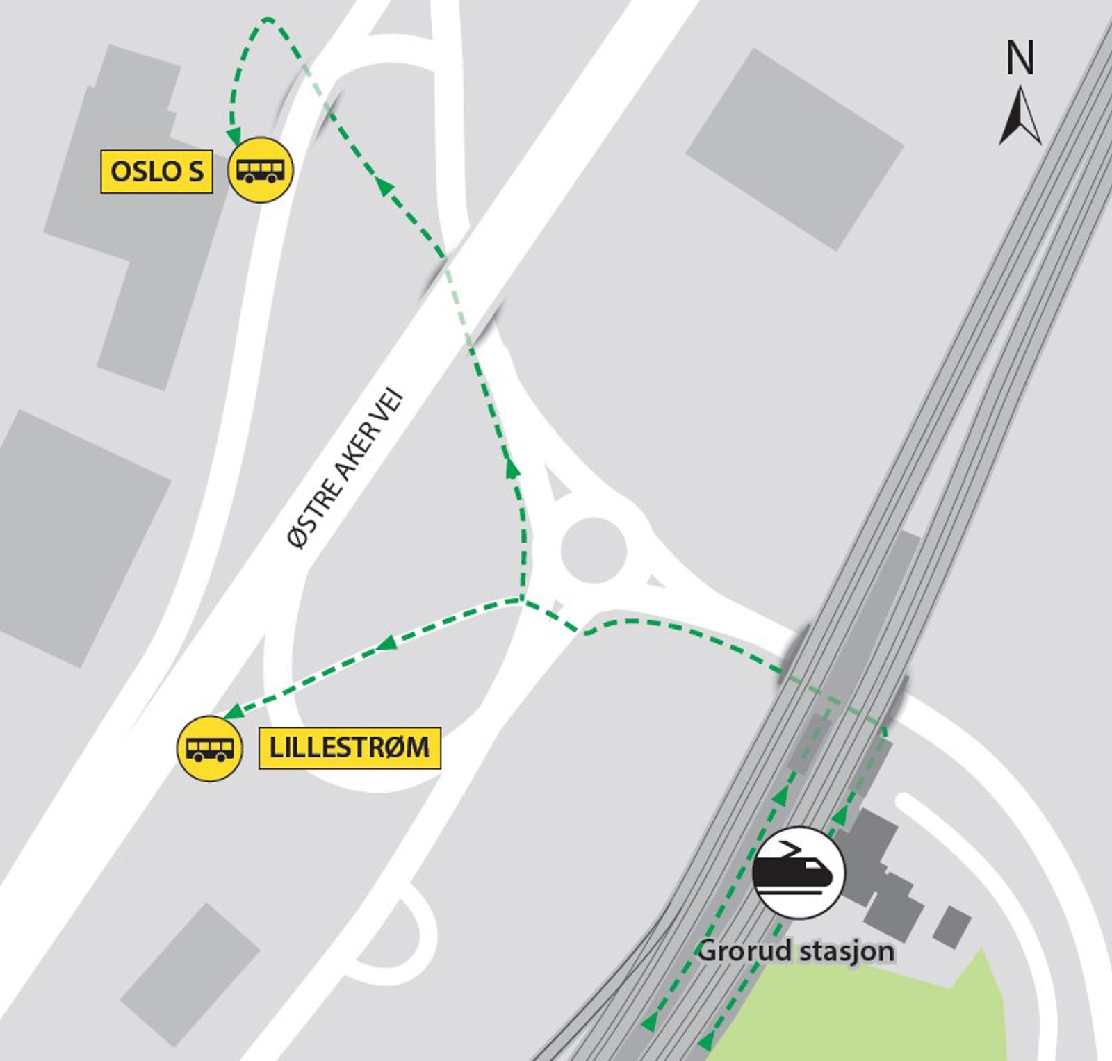 Rail replacement service towards Oslo S departs from Grorud station bus stop near the on-ramp to Østre Aker vei. Follow the footpath. Approximately walking distance, 300 meters.