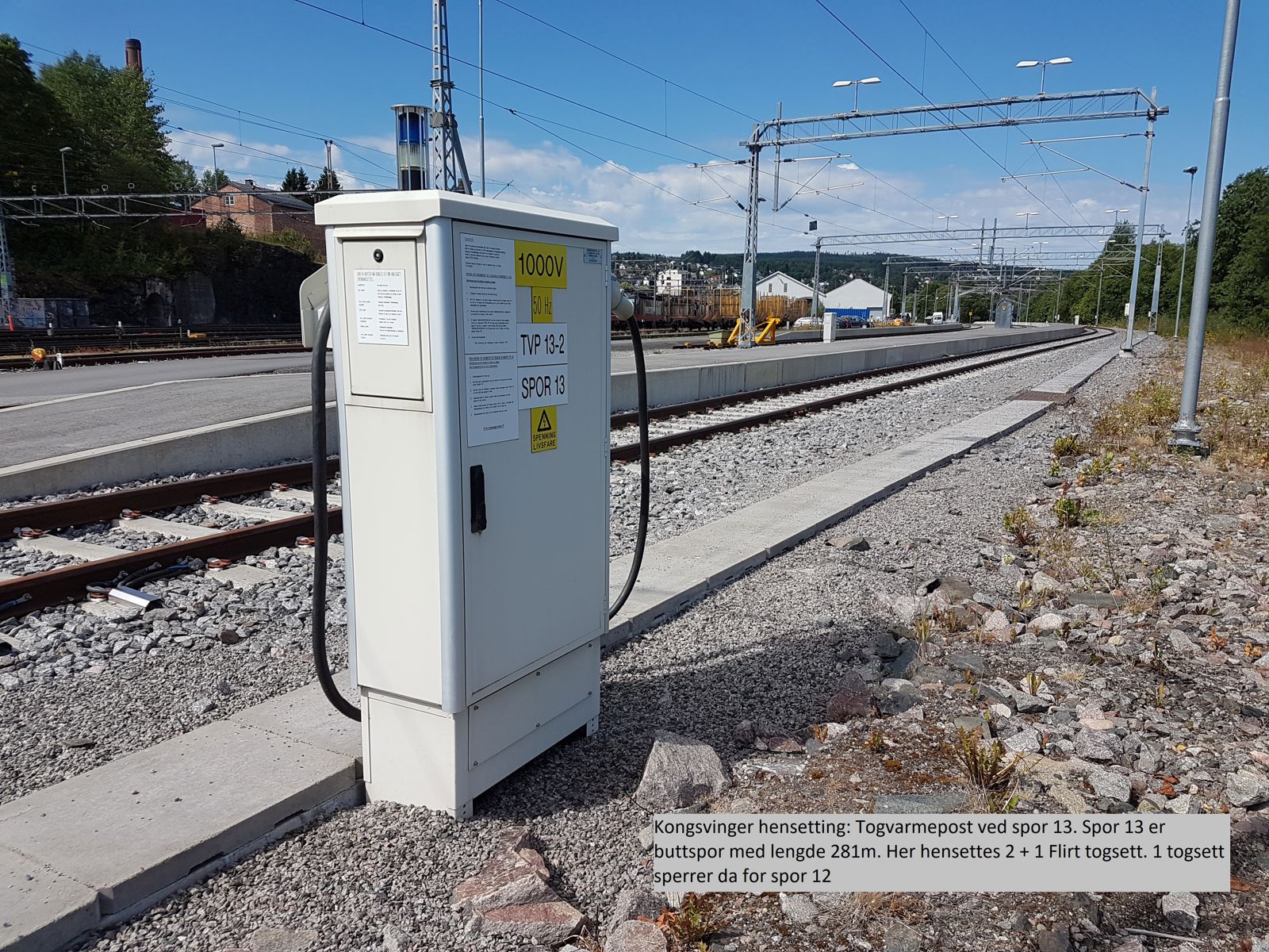 Togvarmepost i spor 13. Spor 13 er buttspor på 281 meter. Her hensettes 2+1 FLIRT. Ett togsett sperrer da for spor 12.