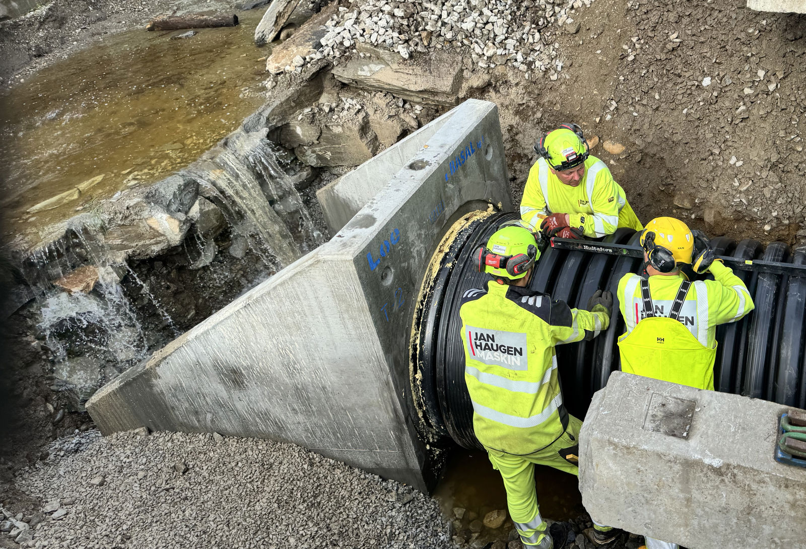 På Fåvang i Gudbrandsdalen etablerte vi høsten 2025 dreneringstiltak som tåler ekstremnedbør for å sike Dovrebanen mot flom og ras. Her etablerer vi en større stikkrenne, som kan lede store vannmengder under jernbanen, og tåle 200- årsflom.
