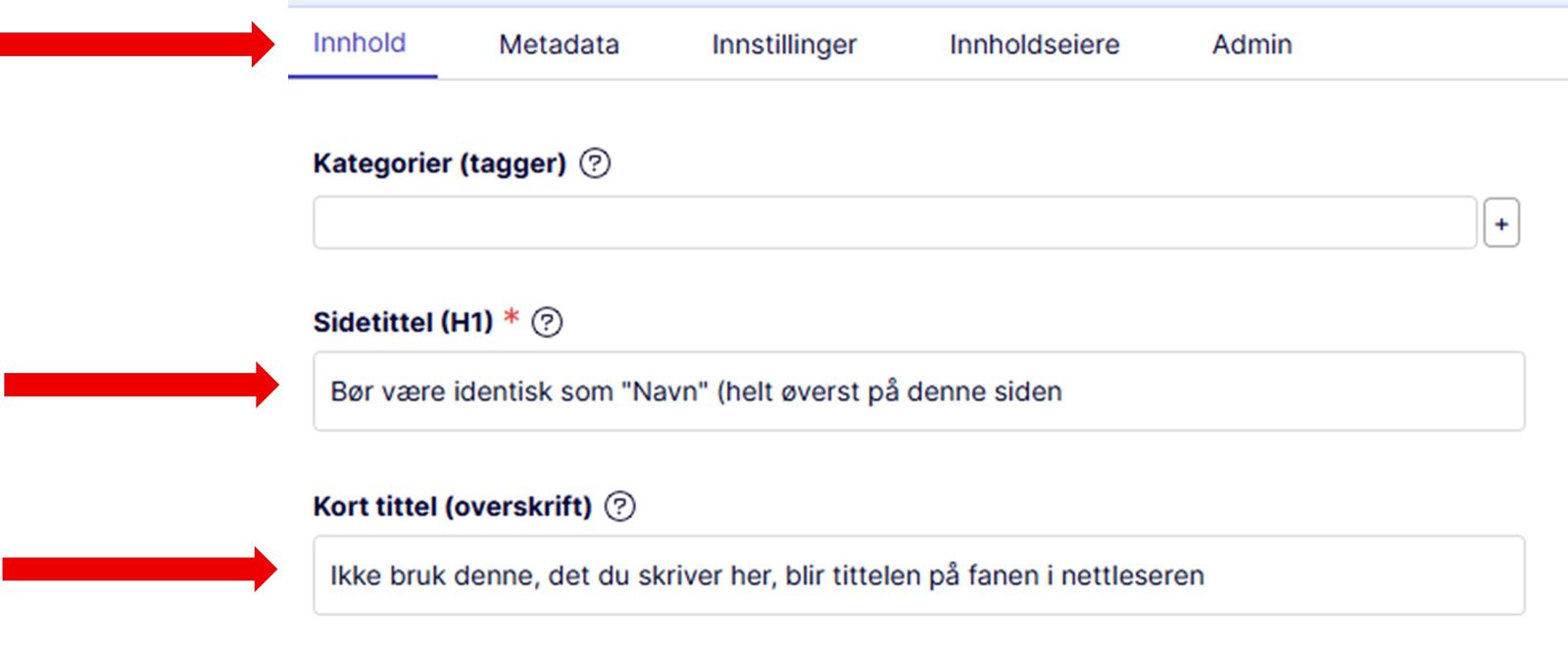 Husk: Kort tittel overskriver både H1 og metatittel, og er ikke anbefalt å bruke. Det er langt bedre å legge dette inn i neste fane, som står beskrevet under dette avsnittet.
