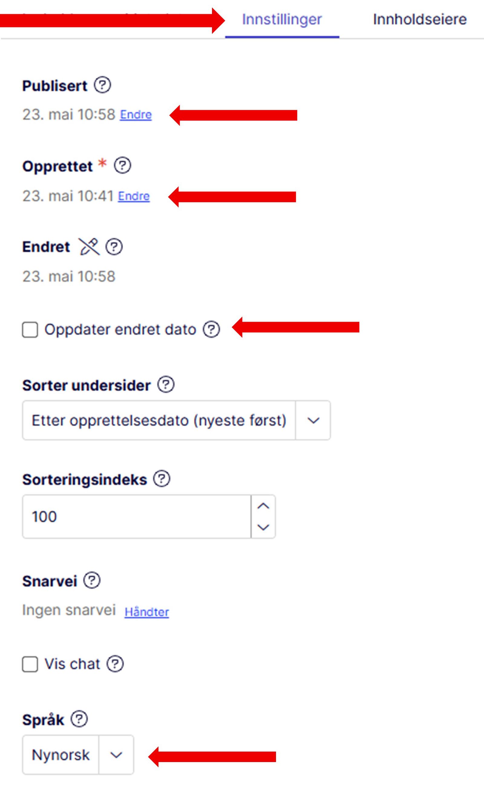 Under denne fanen kan du endre publiseringsdato. Du kan også merke av for "Oppdater endret dato" og da blir det synlig at artikkelen er oppdatert med dato og tidspunkt da du merket av denne boksen.