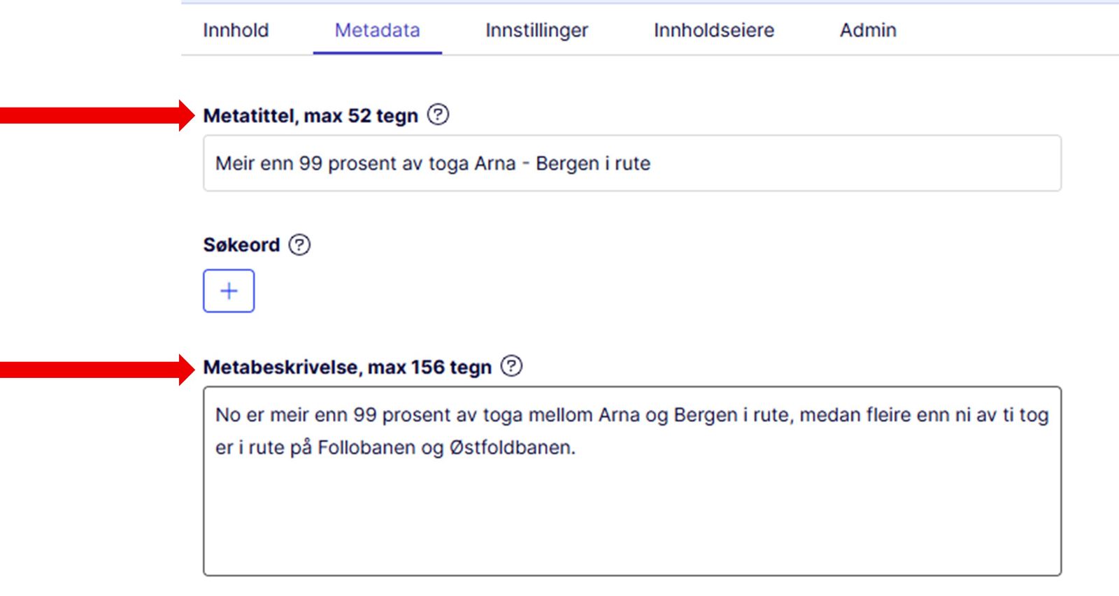 Som du ser i bildet, står det angitt høyeste tillatte tegn, i både feltet "Metatittel" og "Metabeskrivelse", så slipper du å huske på det.