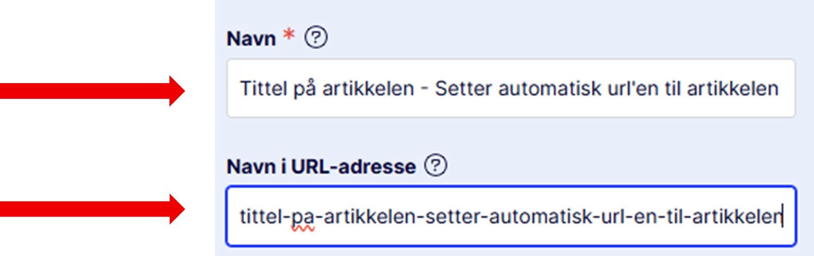 Når du skal lage en ny artikkel, skal du navngi artikkelen først. Hva du skriver her, avgjør hva som blir url'en til artikkelen, og den bør derfor være identisk med Sidetittel H1, som kommer litt lenger ned i malen.