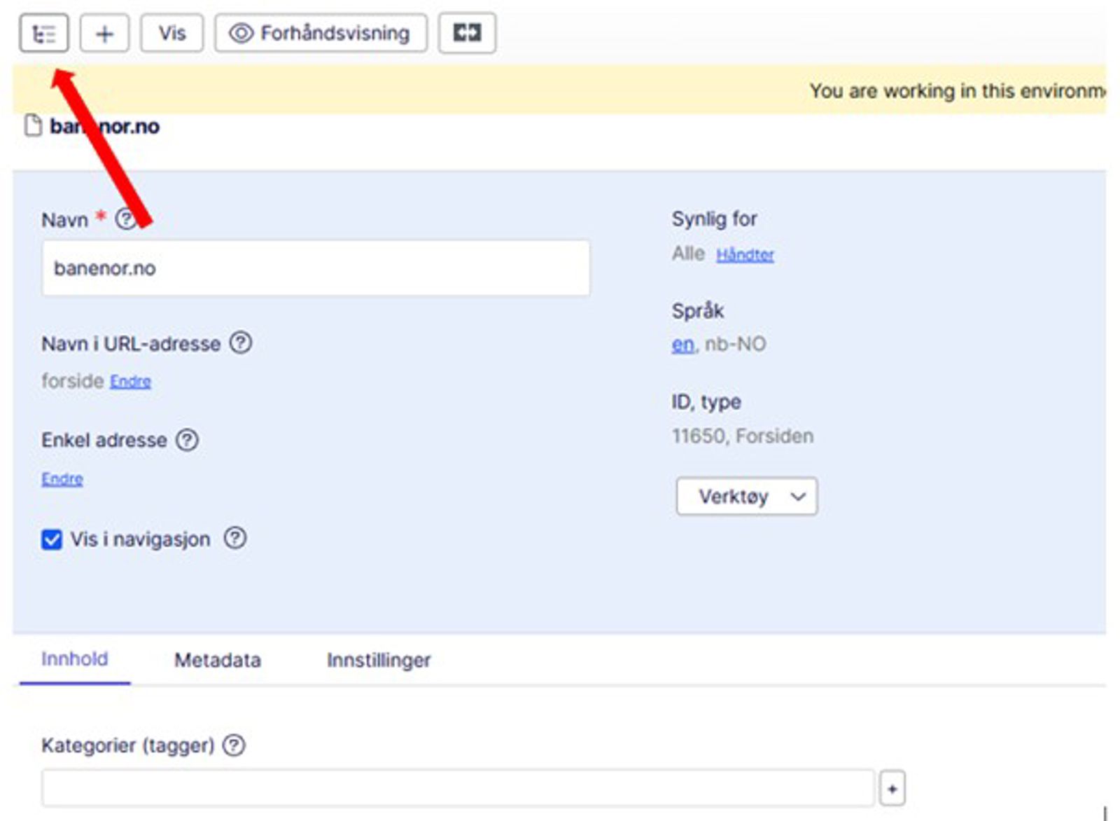 I navigasjonsfeltet ser vi alle sidene på nettstedet sortert og organisert etter lenkestruktur. Det betyr at for å redigere en underside kan vi navigere lenkestien i navigasjonsfeltet.