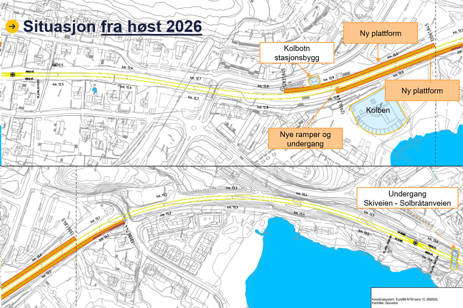 Kolbotn stasjon skal bygges om fordi plattformene er for korte til å kunne brukes av nye lokaltog, som kommer i trafikk på toglinjene L1 Spikkestad-Lillestrøm og L2 Oslo-Ski fra 2026. Vi skal bygge om fra tre til to spor på stasjonen, rive midtplattformen og bygge to nye sideplattformer. Dette er omfattende tiltak, og hovedarbeidene begynner i 2025.