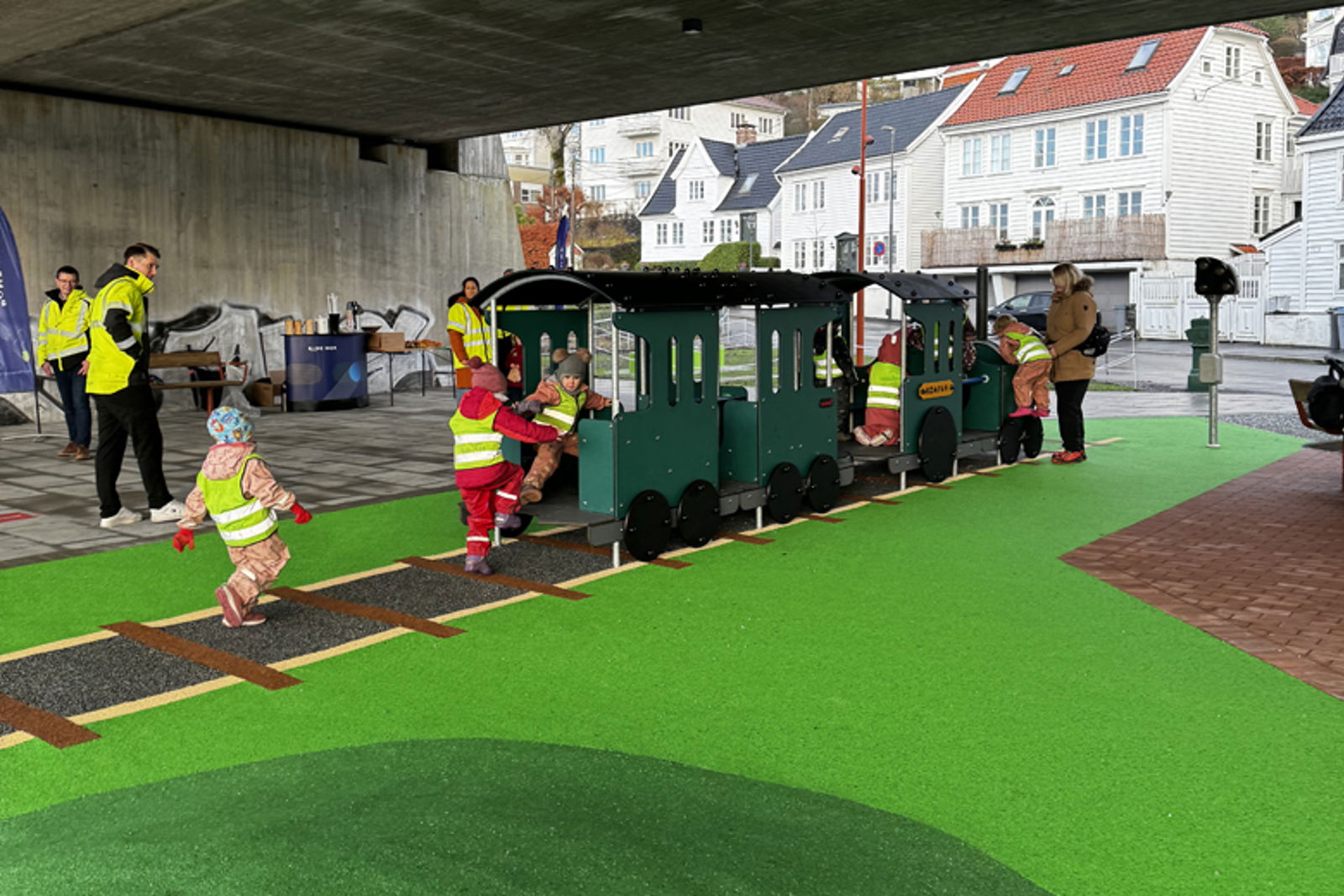 Den mer enn to mål store jernbaneparken er utstyrt med både benker og lekeapparater, og også her har prosjektet lagt vekt på resirkulering og gjenbruk. For eksempel har leketoget paneler som består av mer enn 95 % resirkulert havavfall, og overskuddsmateriell fra byggingen av dobbeltsporet er gjenbrukt til å bygge «ekte» jernbanespor som et visuelt element i den grønne delen av parken.