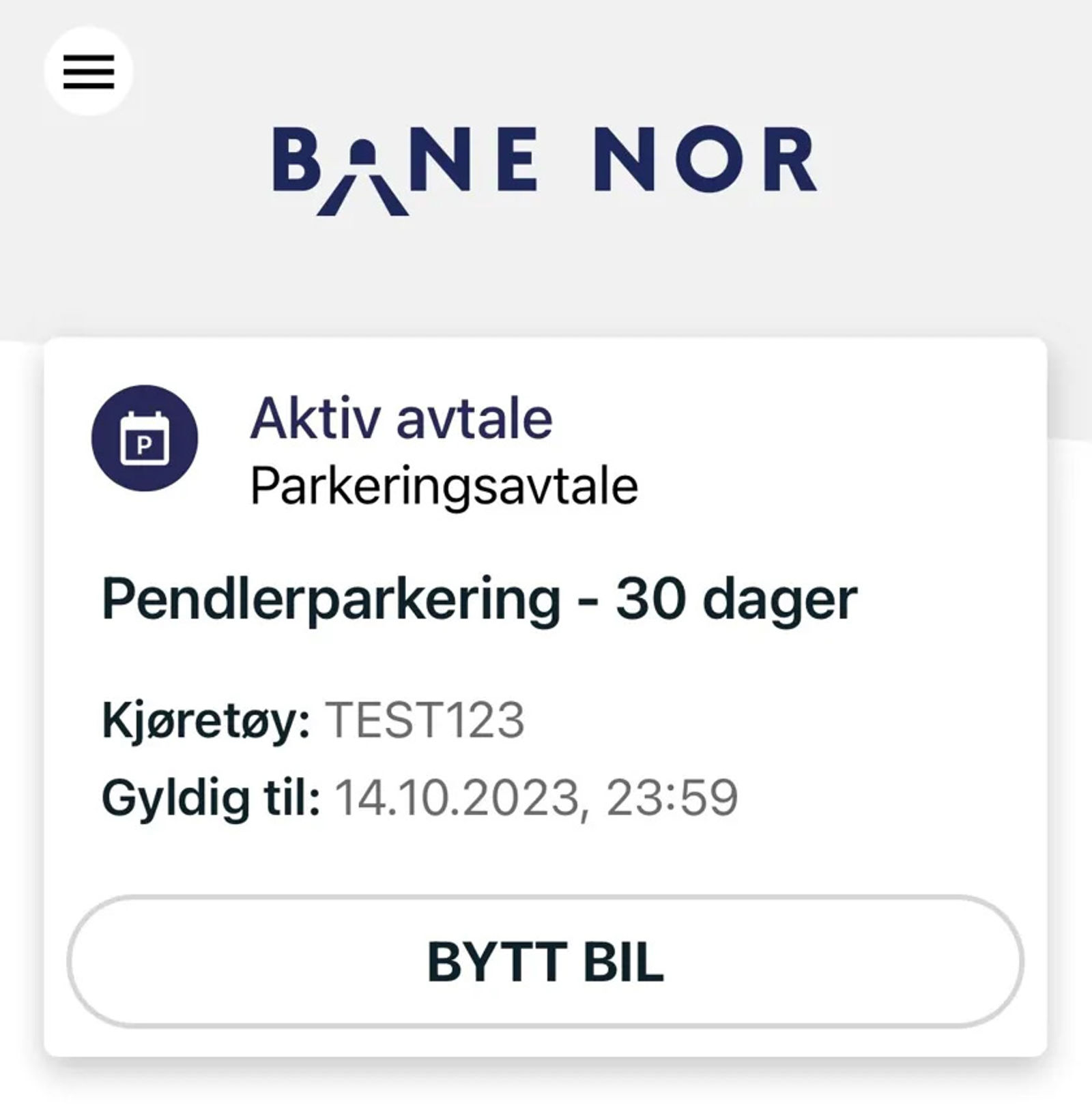 Parkeringsavtalen er aktiv når den ligger som «Aktiv avtale» på Hjem-siden i appen. Da ser det slik ut: