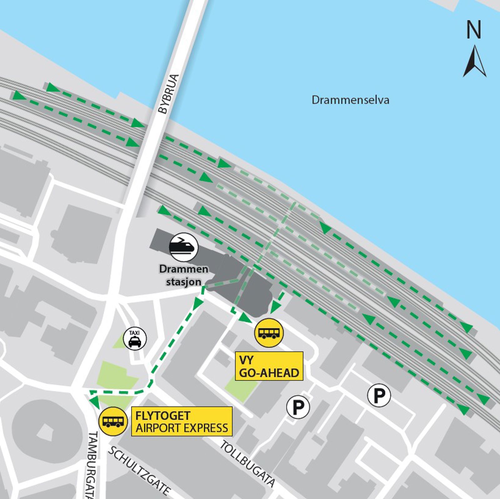 Drammen stasjon ligger på Drammenbanen. Herfra kan du ta toget til store deler av Øst- og Vestlandet.