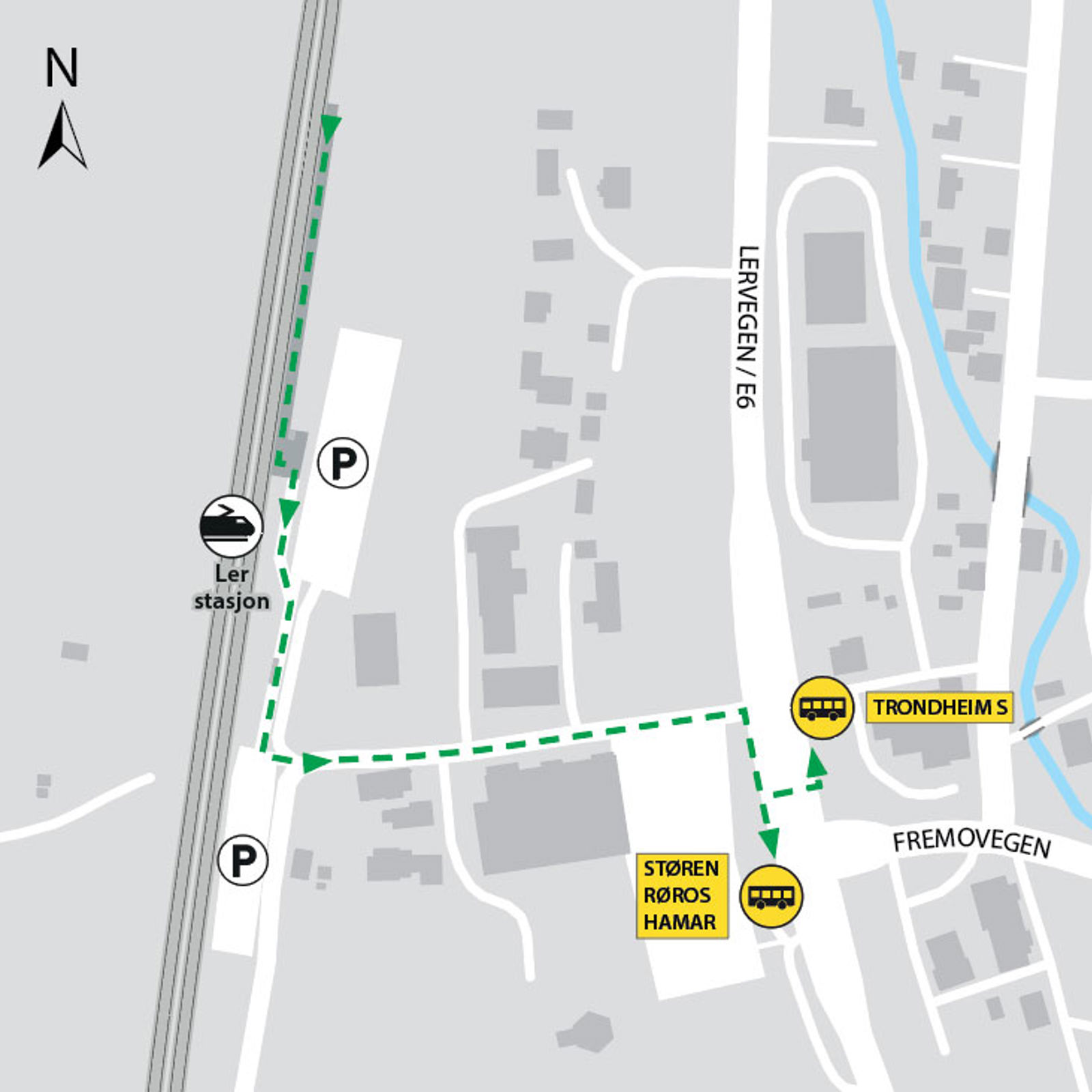 Ler stasjon i Melhus ligger på Dovrebanen. Herfra kan du ta toget mot Trondheim S, Oppdal, Røros og Hamar.