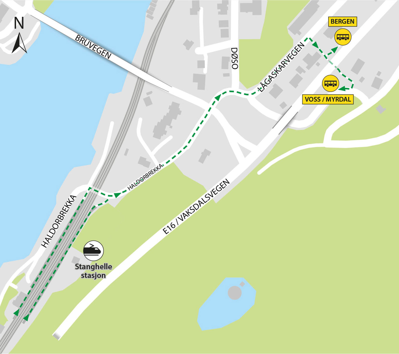 Bussene kjører fra holdeplassene Stanghelle sør ved E16. Gangavstand er ca. 450 meter.