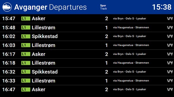 Dataene er hentet fra ruteplan og oppdatert med sanntidsinformasjon fra kunde- og trafikkinformasjonssystemet i Bane NOR.